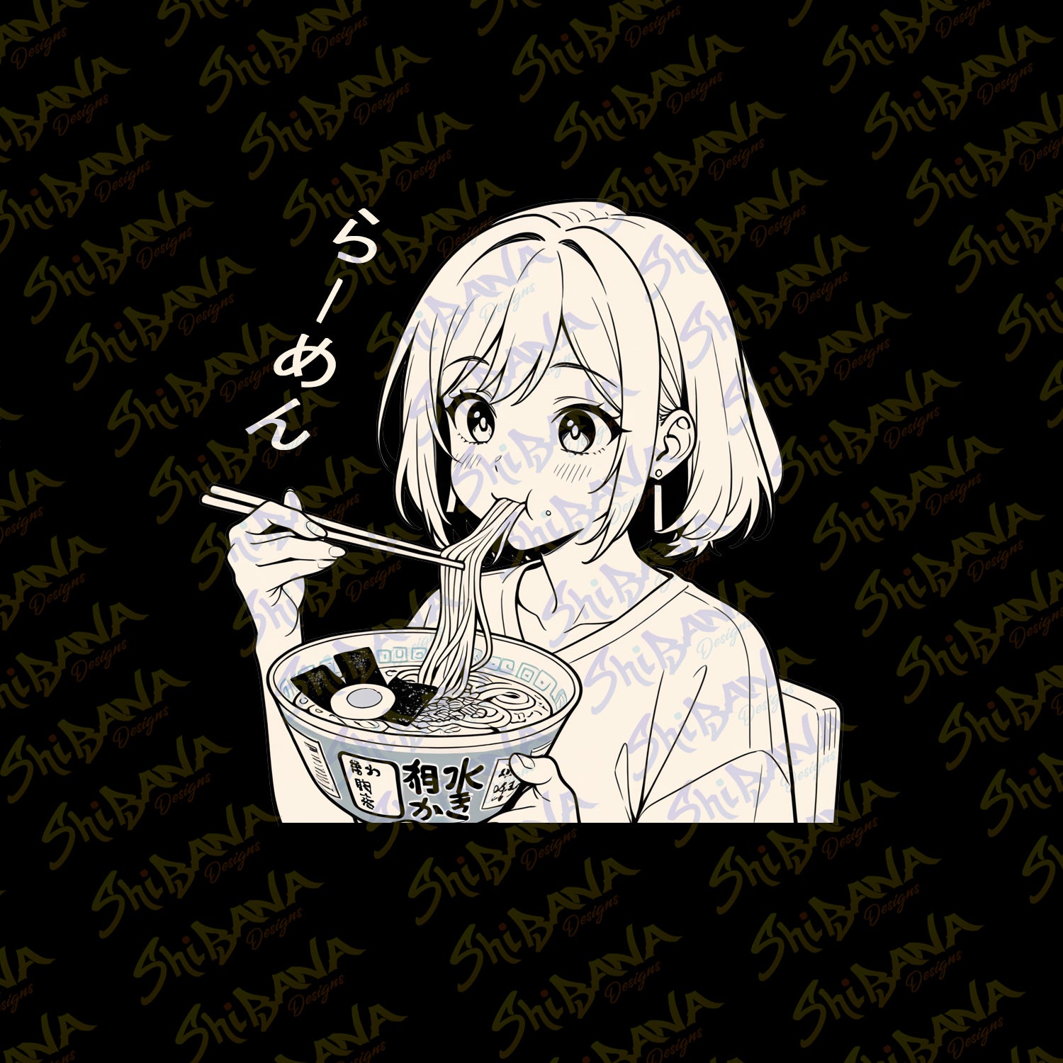 This is a cut out sticker with a manga girl eating her bowl of delicious ramen, with the Japanese hiragana for ramen next to her! Oh how delicious!